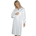 Camice donna antinfortunistico a manica lunga bianco. Settore medicale, estetico, sanitario e industria. Ottima divisa da lavoro per medico, infermiere, farmacista o camice da lavoro per imprese di servizi o alimentari.