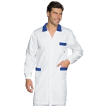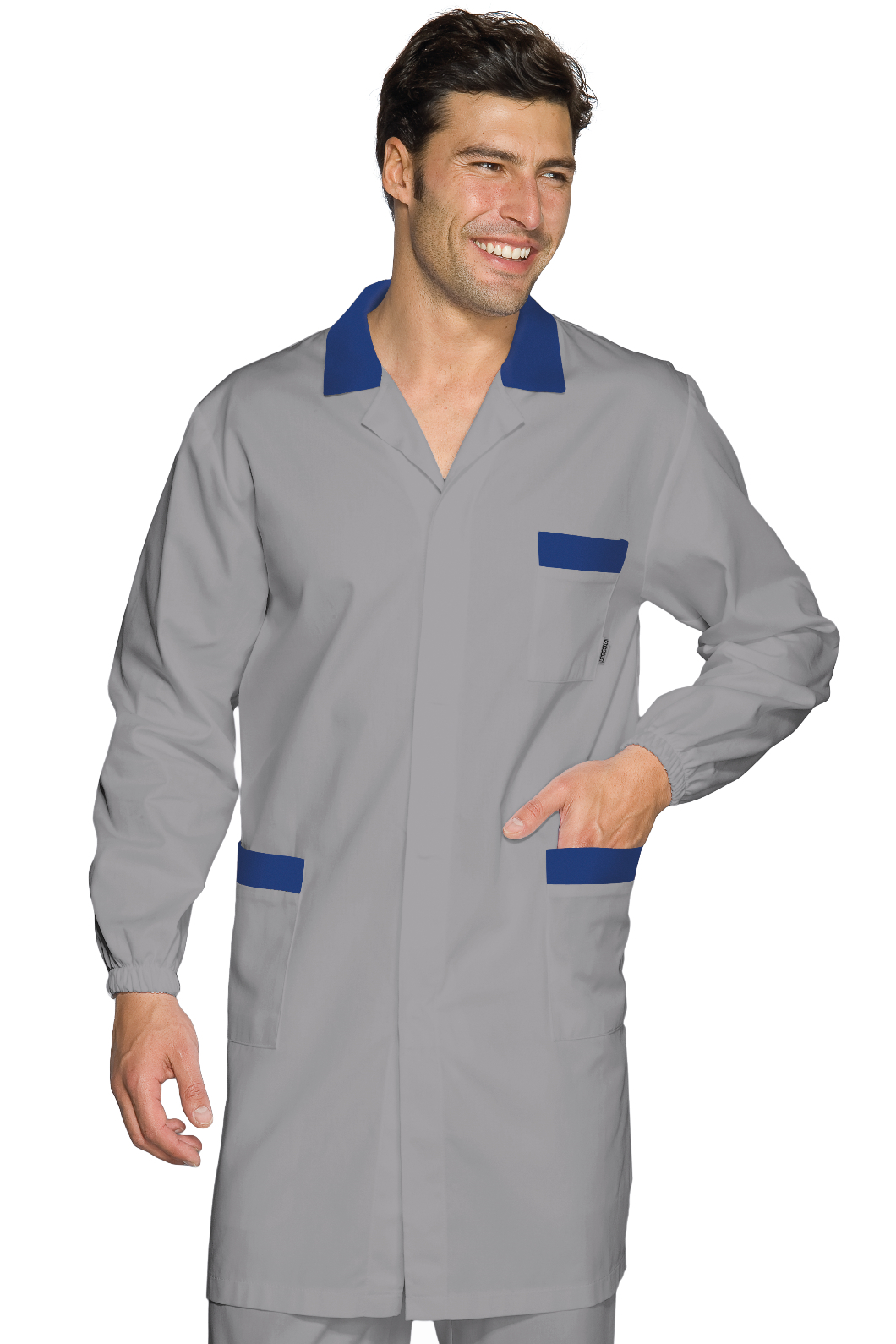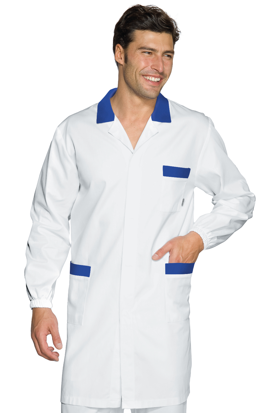 Camice da uomo Toronto lungo 100 cm con inserti a manica lunga blu e righe blu. Settore medicale, estetico, sanitario e industria. Ottima divisa da lavoro per farmacista e magazziniere. Bottoni a pressione coperti e tasche e taschino al petto.