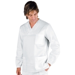 Casacca con collo a V unisex a manica lunga bianco. Per settore medicale, estetico, sanitario e ospedaliero. Ideale come divisa da lavoro per medico ed infermiere uomo e donna. Con 2 tasche e taschino al petto.