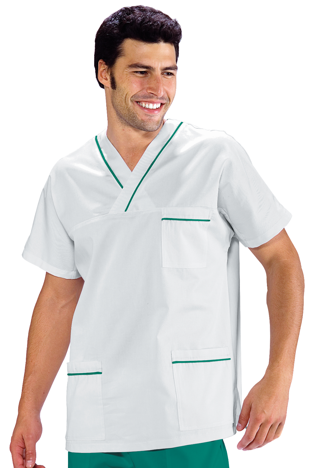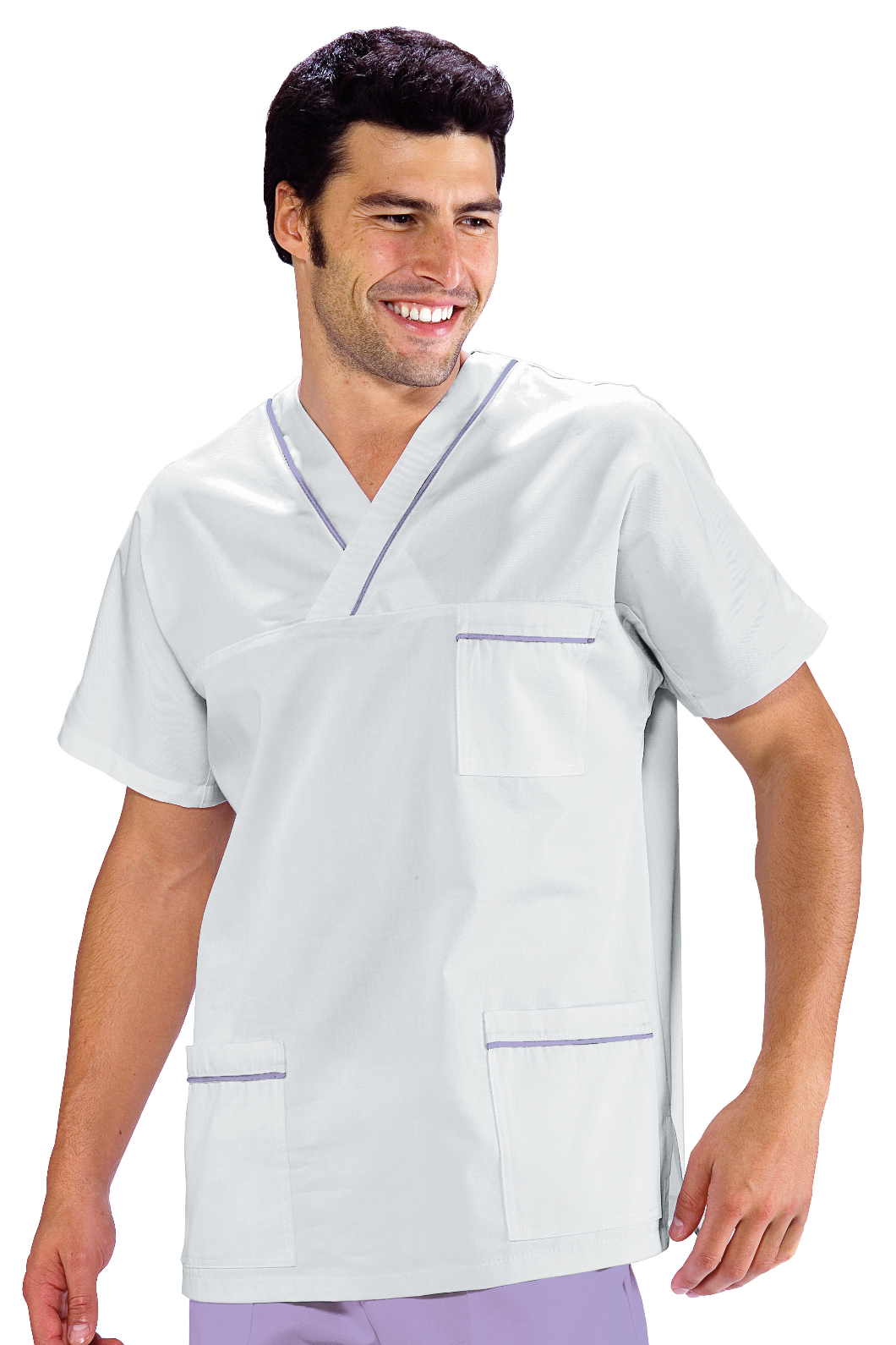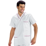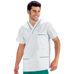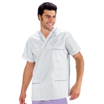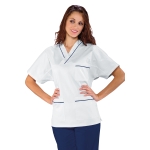 Casacca collo a V unisex con profilo al collo e alle tasche a mezza manica bianco e blu. Per settore medicale, estetico, sanitario e ospedaliero. Ideale come divisa da lavoro per medico ed infermiere uomo e donna. Con 2 tasche e taschino al petto.