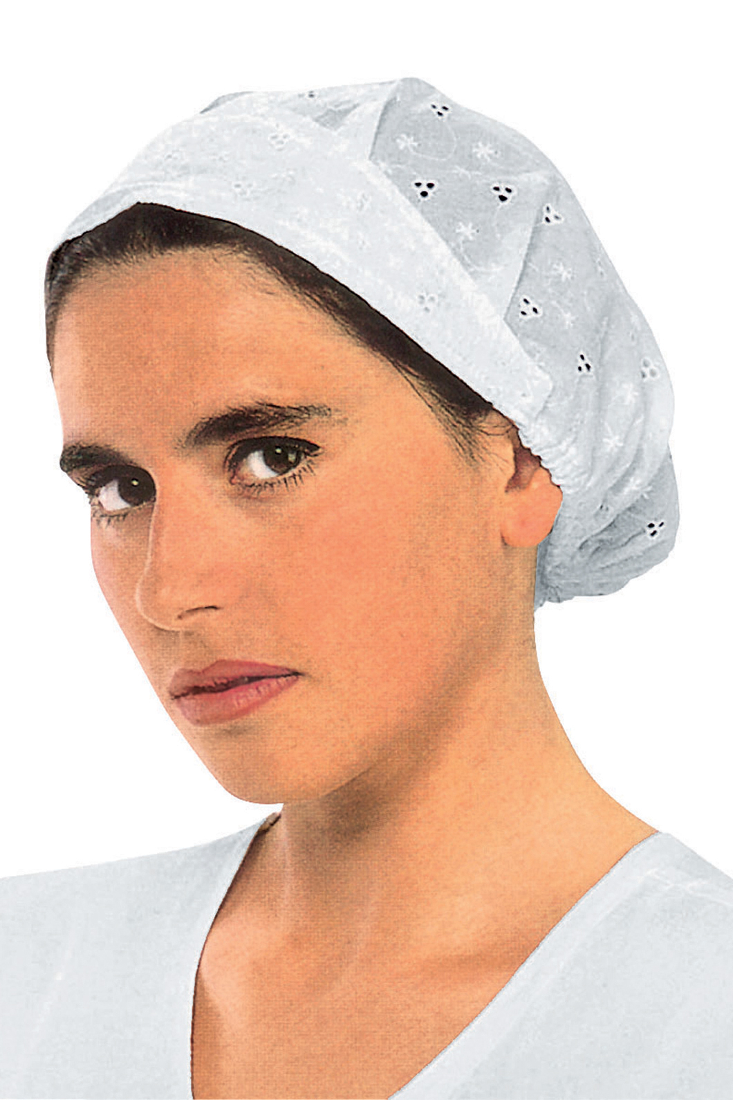 Cuffia donna con rete bianco. Ottima per il settore alberghiero e ristorazione. Divisa da lavoro per negozi alimentari, cucine e gelaterie. Regolabile con elastico, alternativa cappello o bustina.