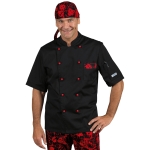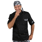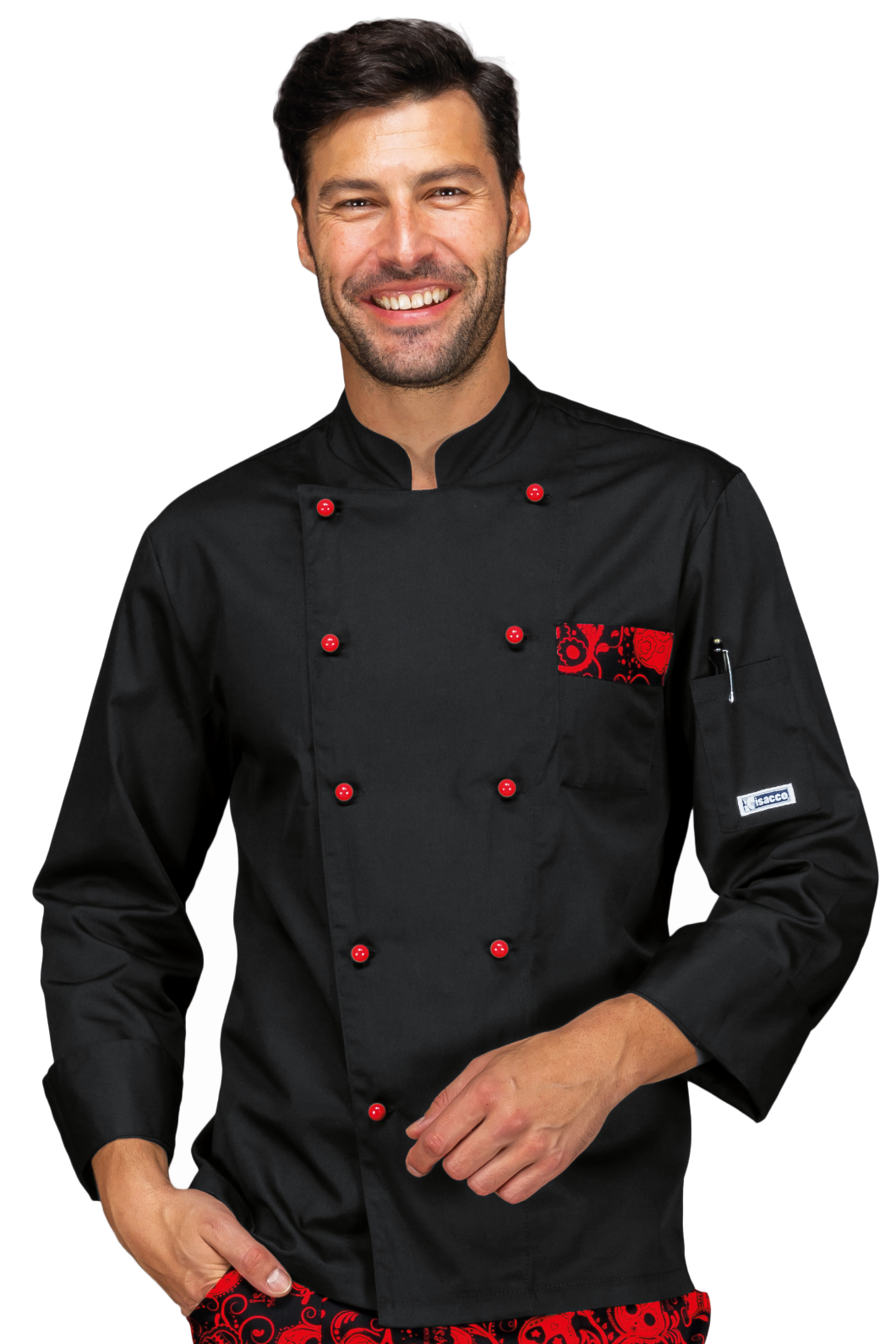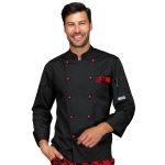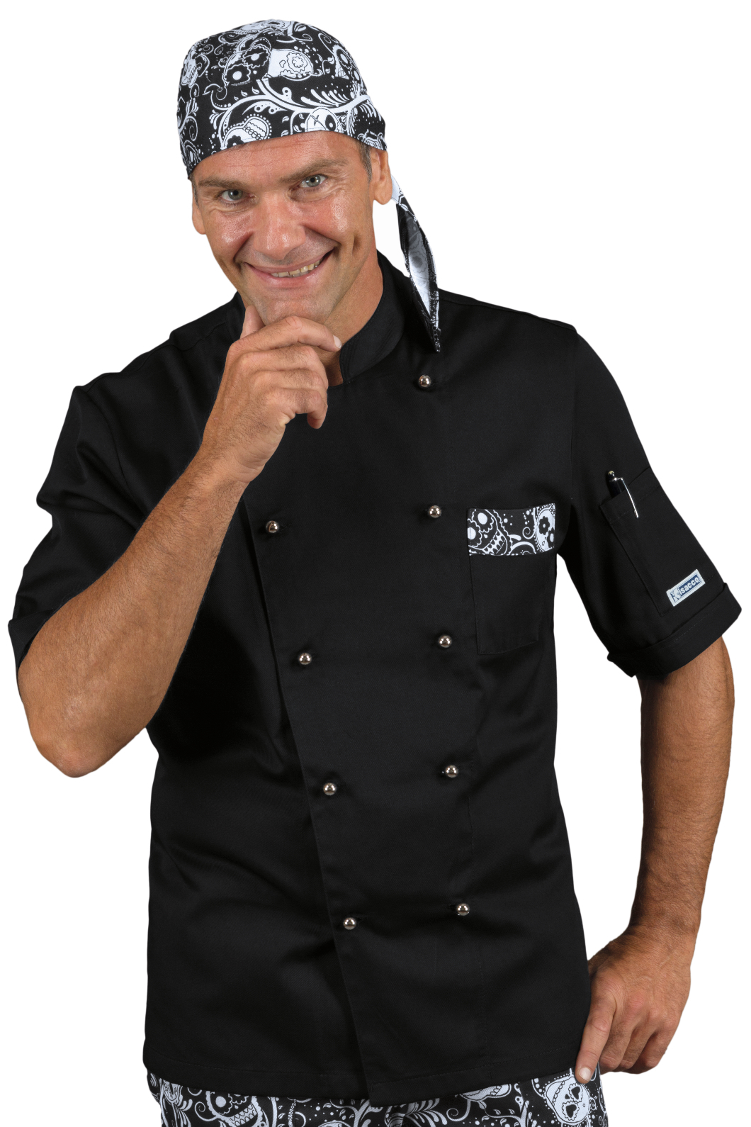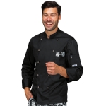 La Giacca da Cuoco Atlanta unisex a manica lunga nero e skull 12. Ottima divisa per uomo e donna da chef in cucina, ristorante o catering. Taschino al petto e alla manica con allacciatura con bottoni antipanico. Con dettagli in contrasto.