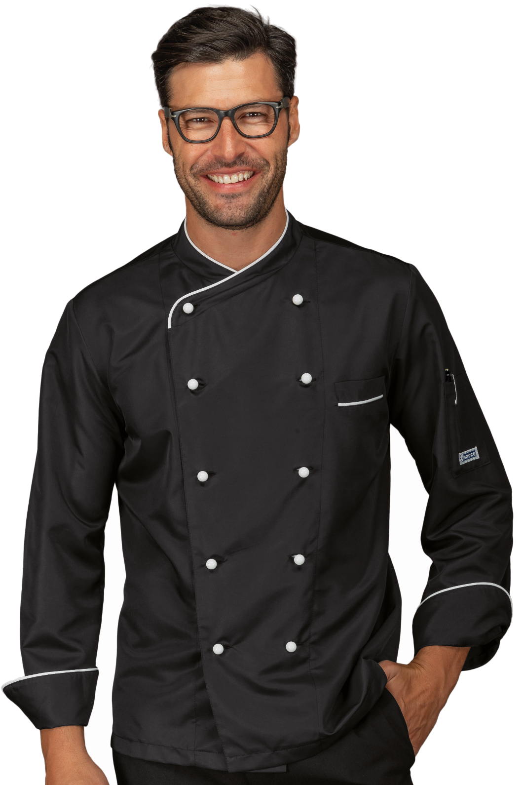 La Giacca da Cuoco California slim unisex a manica lunga bianco e nero. Ideale come divisa per uomo e donna da chef in cucina, ristorante o catering. Taschino al petto e alla manica con allacciatura con bottoni antipanico.