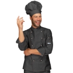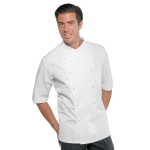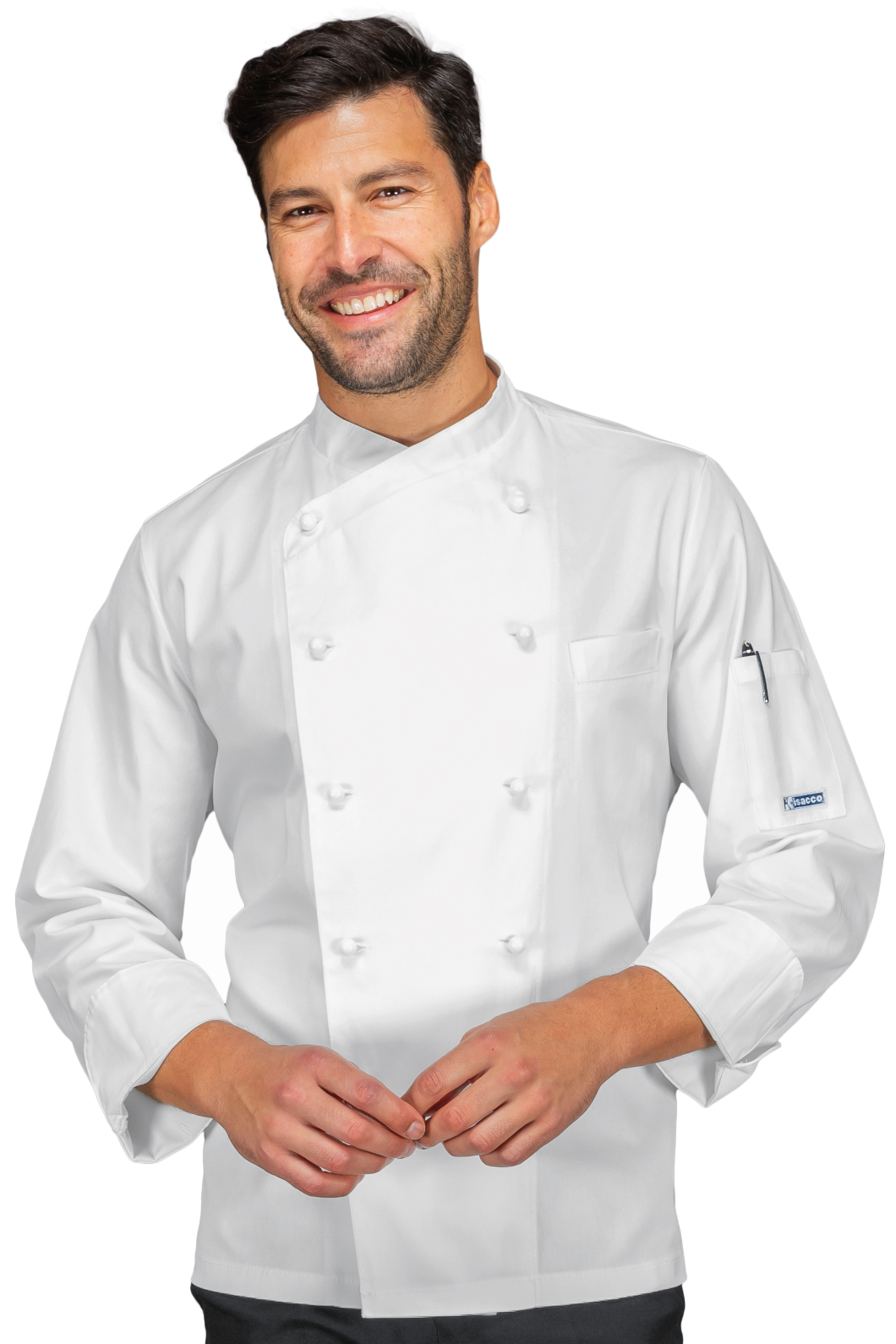 La Giacca da Cuoco Panama slim unisex a manica lunga bianco. Ideale come divisa per uomo e donna da chef in cucina, ristorante o catering. Taschino al petto e alla manica con allacciatura con bottoni antipanico.