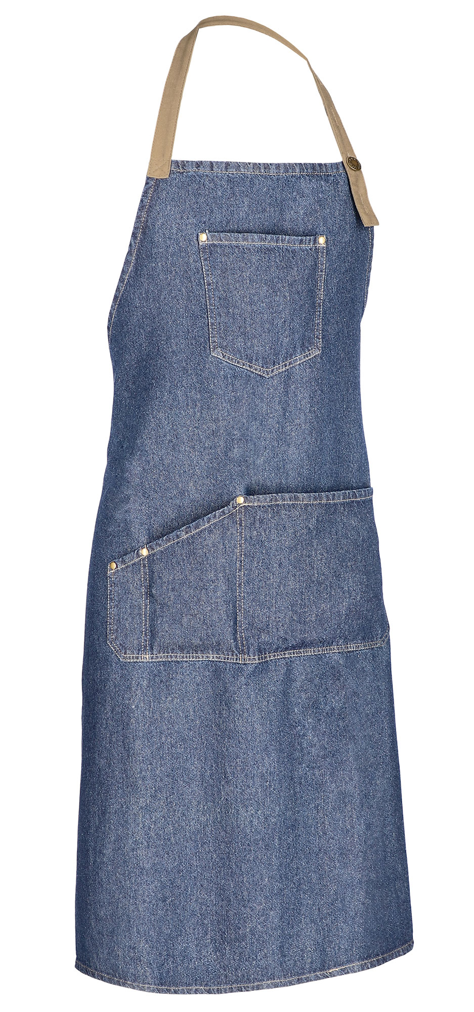 Grembiule con pettorina multitasche in jeans lungo. Realizzato in tessuto denim prelavato 100% cotone morbido e confortevole. Cinturini laterali spessi, in color cammello, da regolare con nodo in vita e spalline larghe regolabili mediante bottone in metallo da appendere al collo.Tasca sul petto per evidenziare il brand e ampia tasca centrale compartimentata per tenere tutto a portata di mano. Contorni con cuciture raddoppiate e borchie metalliche sulle tasche che ne rinforzano la struttura. Metodi di personalizzazione idonei: serigrafía, ricamo, trasferimento, patch. Ideale come divisa da ristorazione e abbigliamento promozionale.