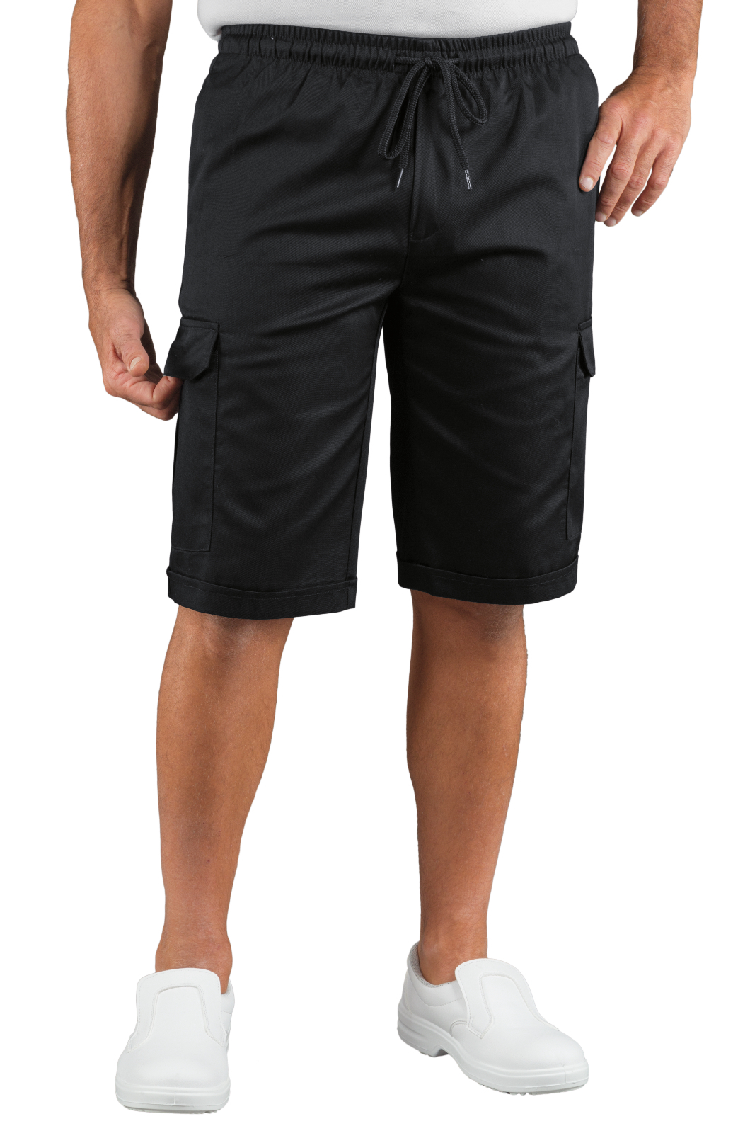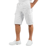 Pantacargo Short con elastico nero. Ideale per settore estetico e alimentare. Utilizzata come divisa da lavoro per aziende di servizi, pulizie e cucina e divisa da cuoco e industria. Con laccio in vita e tasconi cargo laterali.