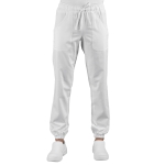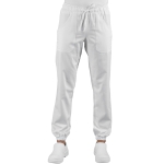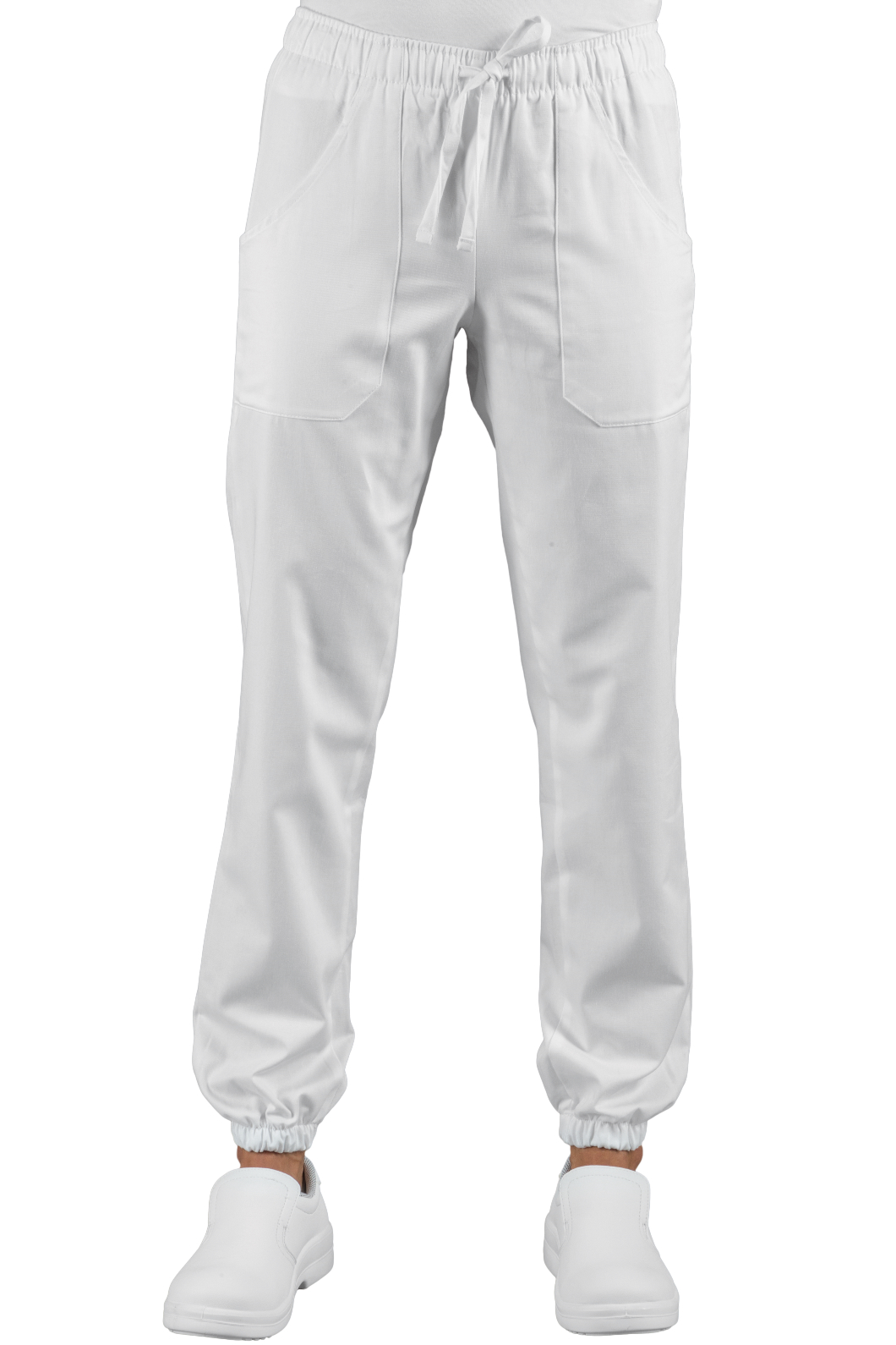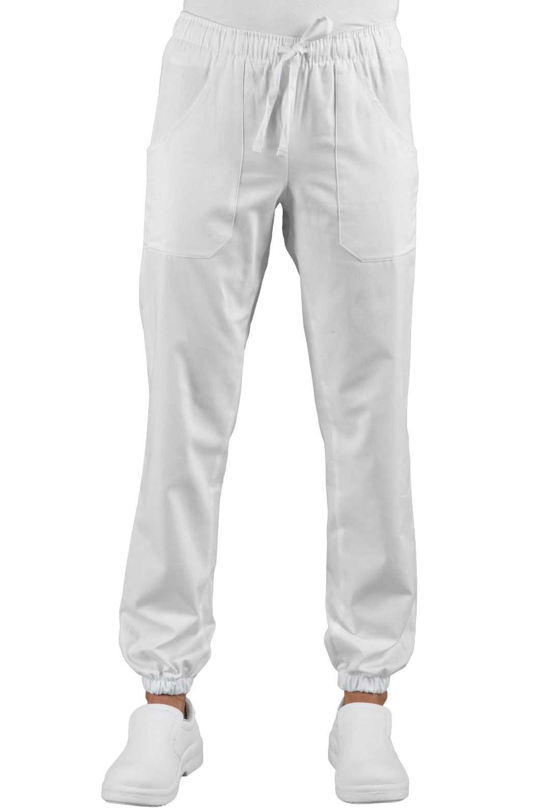 Pantagiaffa unisex con elastico alle caviglie bianco. Molto utilizzato anche nel settore medicale, estetico, sanitario, ospedaliero e alimentare. come divisa da lavoro medico , infermiere, per aziende di servizi, pulizie e cucina e cuoco.