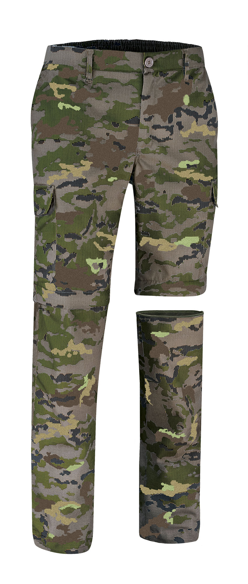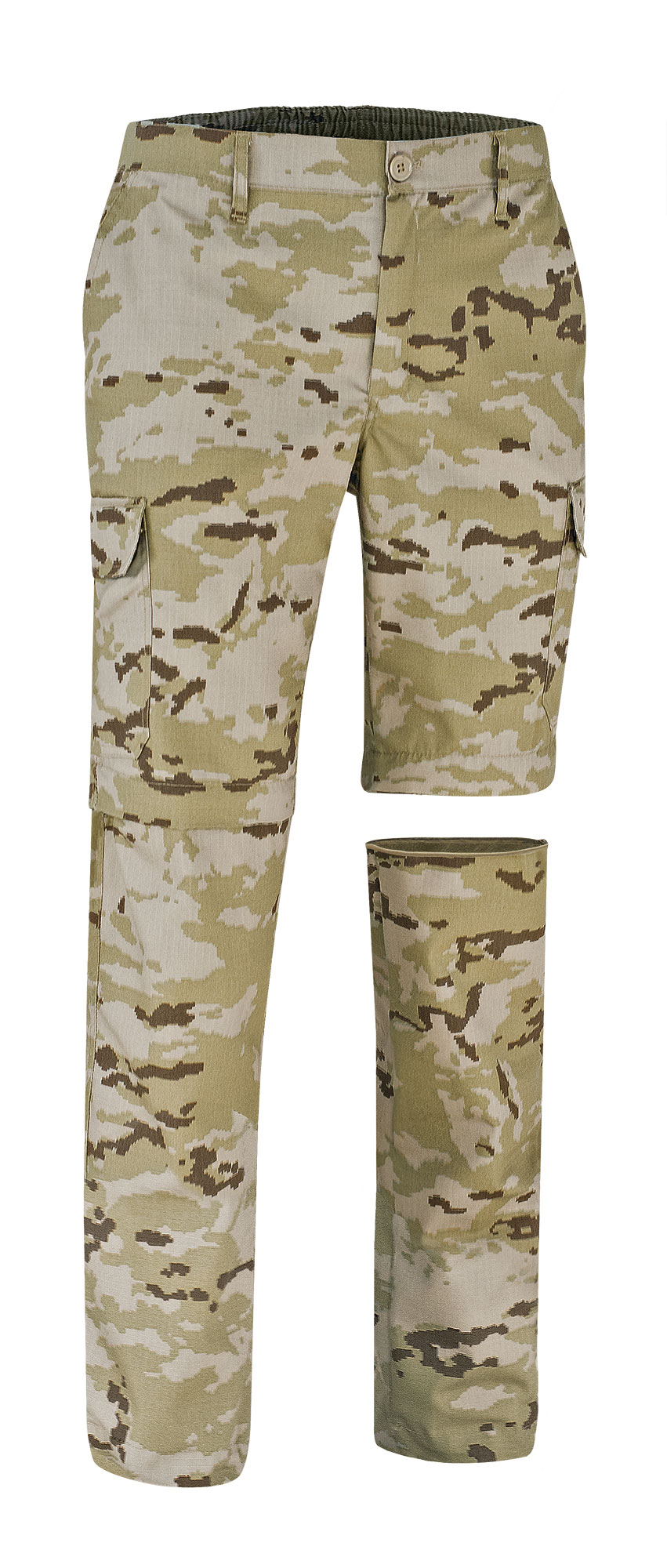 Pantaloni multitasche staccabili con disegno mimetico pixelato in colori combinati all´interno della stessa gamma cromatica. Realizzati in tessuto Ripstop per garantire resistenza e durata. Gambe staccabili con cerniere che le trasformano in pantaloncini quando fa più caldo. Vita con la parte posteriore elastica per una migliore vestibilità e un maggiore comfort. Sei tasche per avere tutto a portata di mano: due sui fianchi, due laterali con soffietto e chiusura con pattina in velcro e due posteriori applicate anch´esse con chiusura con pattina in velcro. Metodi di personalizzazione idonei: serigrafia, trasferimento, vinile, ricamo, patch. Ideale per gli sport di avventura, l´addestramento militare, la pratica di airsoft e le attività all´aperto.