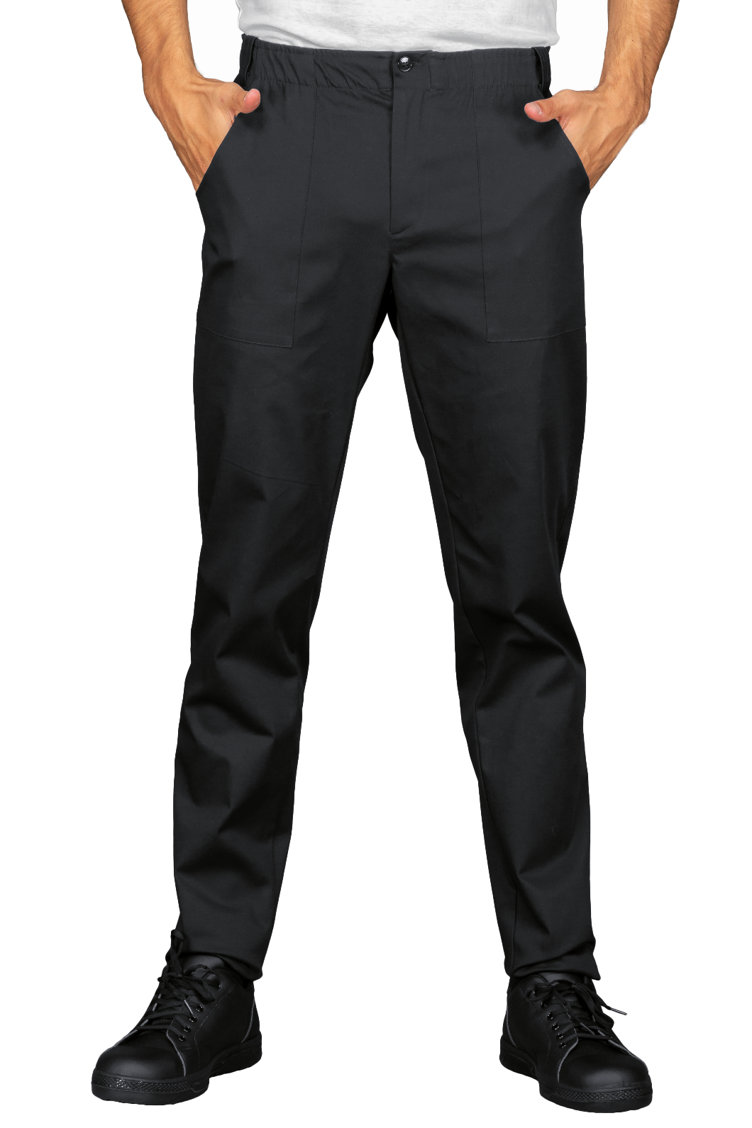 Pantalone uomo Vermont da lavoro nero. Per settore alimentare, medicale e alberghiero. Ottima divisa da lavoro per cucina (chef cuoco), aziende e industrie. Con elastico e bottone in vita, 2 tasche davanti, 2 tasche posteriori.