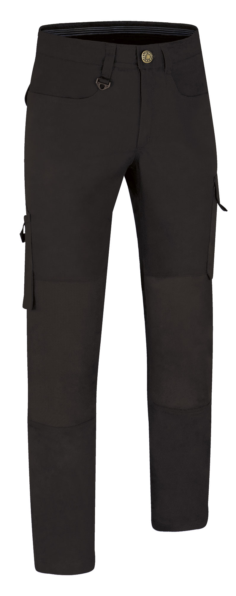 Pantaloni da lavoro multitasche. Realizzati in tessuto canvas, misto cotone/poliestere con rinforzi in tessuto poliammidico, entrambi idrorepellenti, resistenti e durevoli. Chiusura con bottoni in metallo e cerniera nascosta sotto l´abbottonatura, cintura con passanti (anteriore destro con anello per appendere tessere o accessori) ed elastico con fili di gomma antiscivolo all´interno per un maggiore comfort e una migliore presa. Due tasche anteriori americane, due tasche posteriori e una tasca laterale sinistra con chiusura a velcro e strappo, una tasca laterale destra per cutter o utensili, tutte con sistema antiperforazione. Triple cuciture principali e punti di maggiore trazione rinforzati con passanti di sicurezza per garantire durata e resistenza. Metodi di personalizzazione idonei: serigrafia, ricamo, transfer, vinile. Ideali come abbigliamento da lavoro e divisa da lavoro.